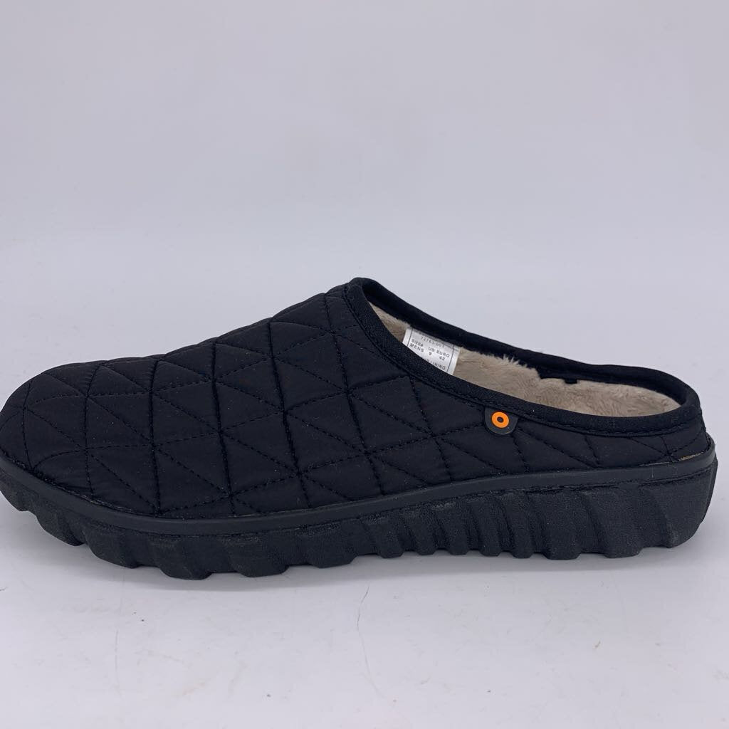 Black quilted slip-on mules with rubber soles and fleece lining.
