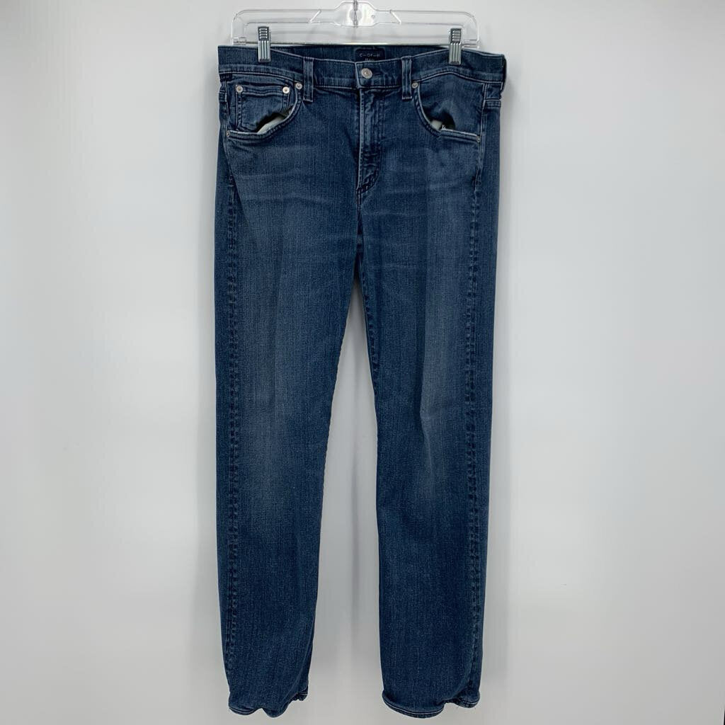 Medium wash denim five pocket jeans. Tagged "Sid" style.