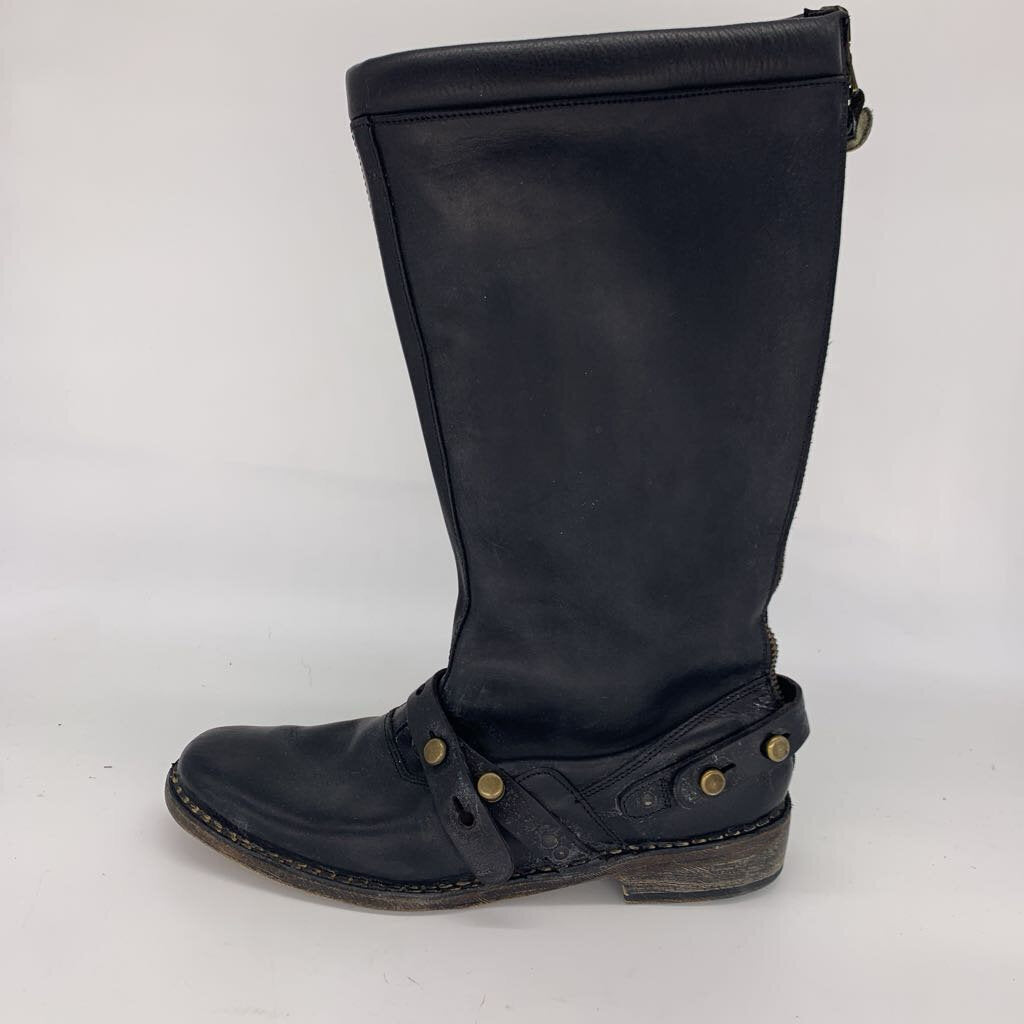 Black leather tall boots with leather and brass strap details. Leather soles. With box.