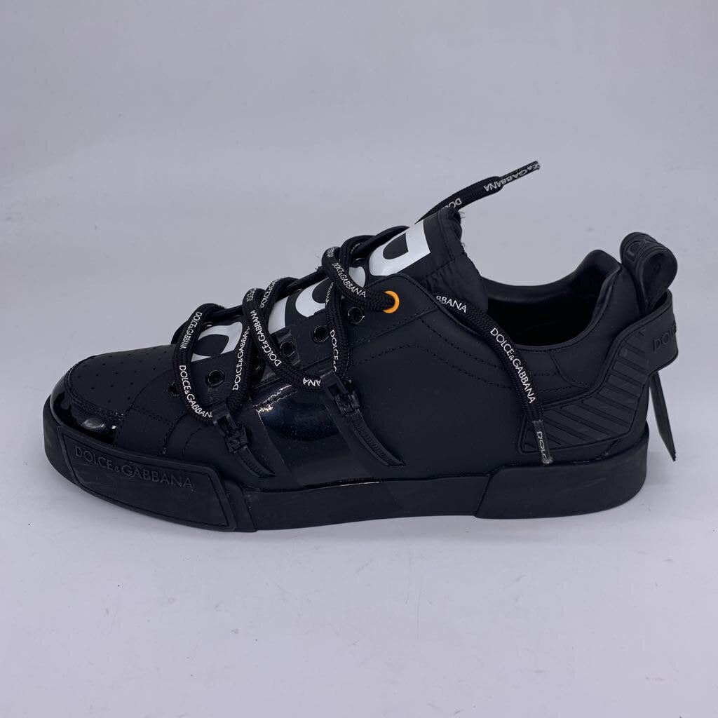 Black Dolce & Gabbana Portofino Sneakers with calf skin and patent leather uppers and rubber soles. Dust bag and box included.
