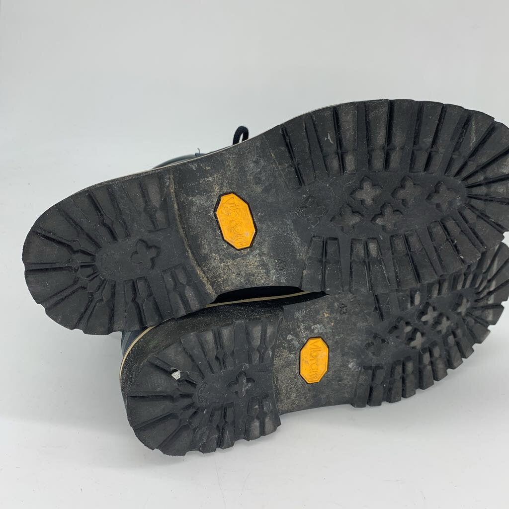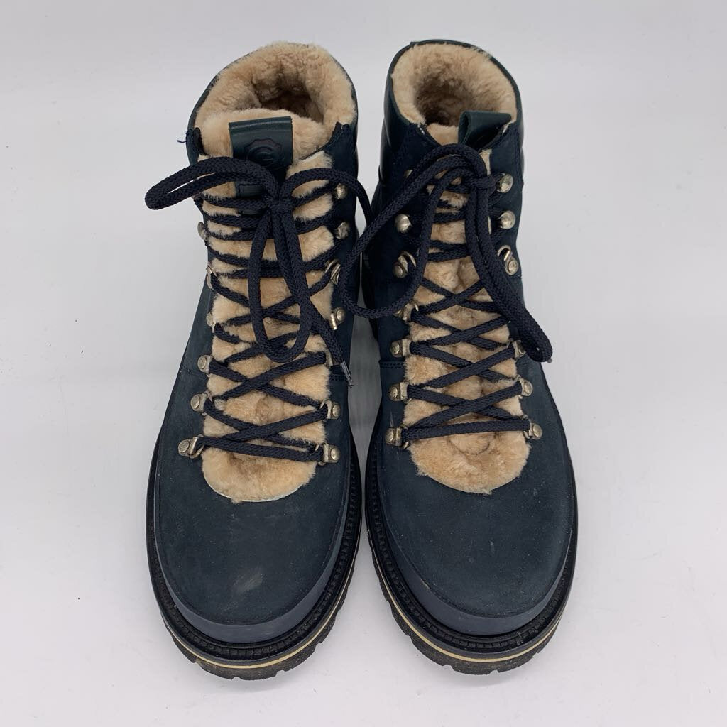 Navy blue suede lace-up boots with sherpa lining and vibram soles.