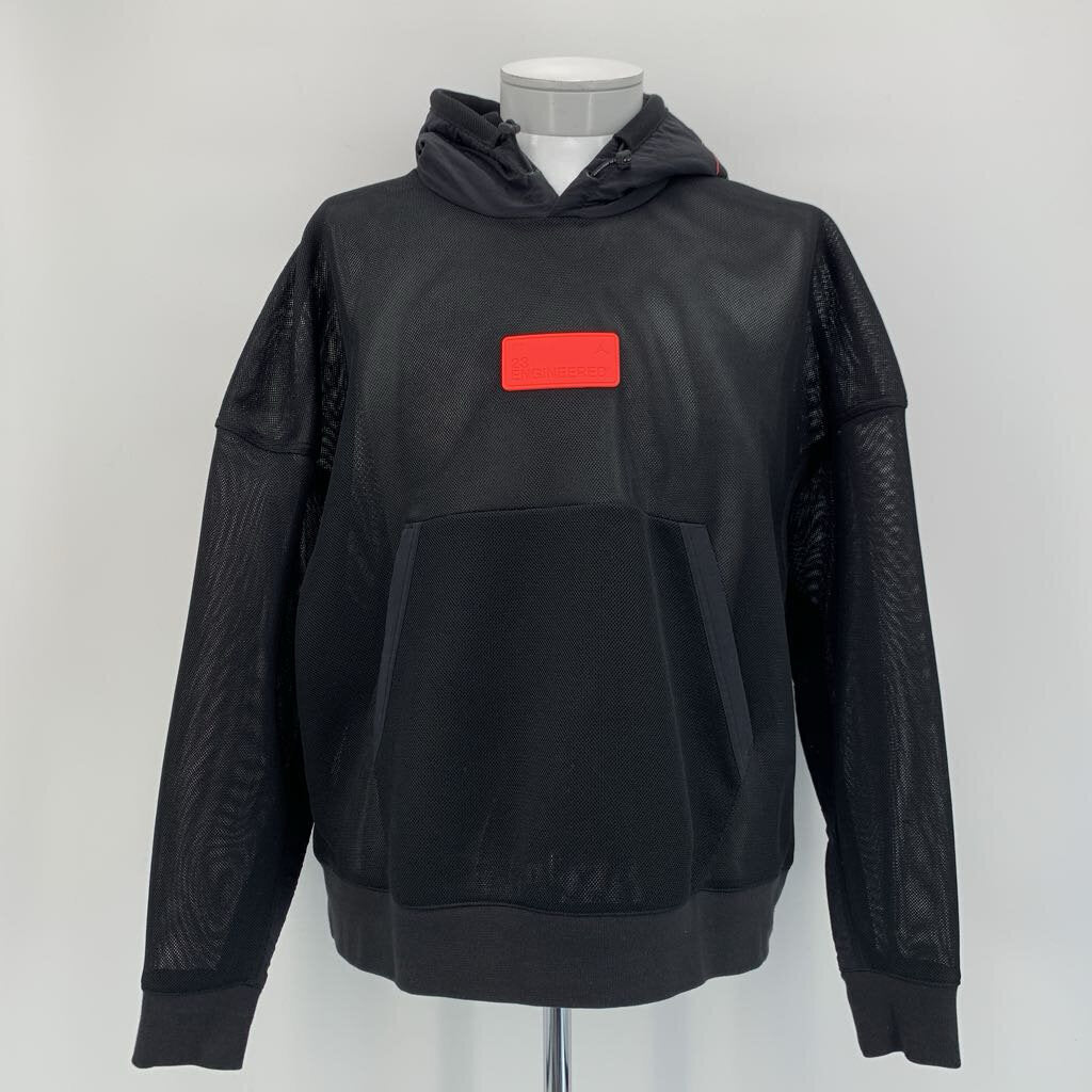 Black '23 Engineered' hoodie. Mesh material. Rubberized front patch.