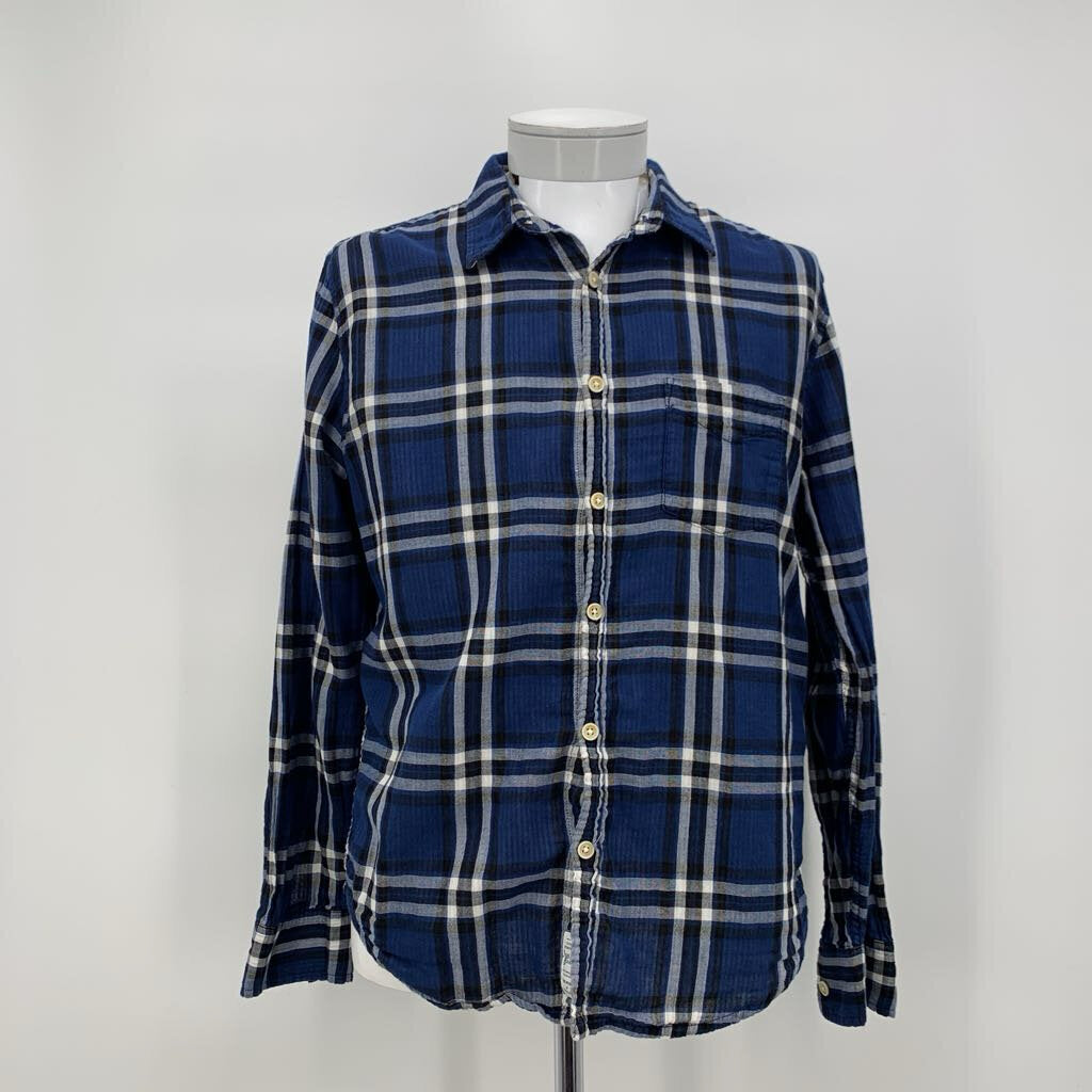 Blue plaid button up long sleeve shirt with single chest patch pocket. Lightly lined.