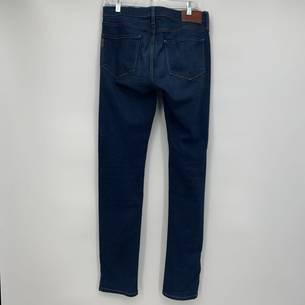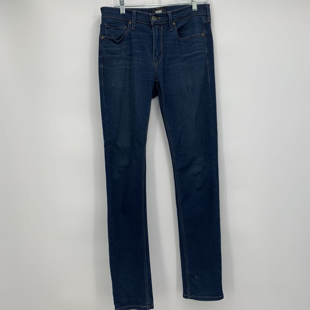 Dark wash denim five pocket jeans with high stretch. Tagged "Lennox" style.