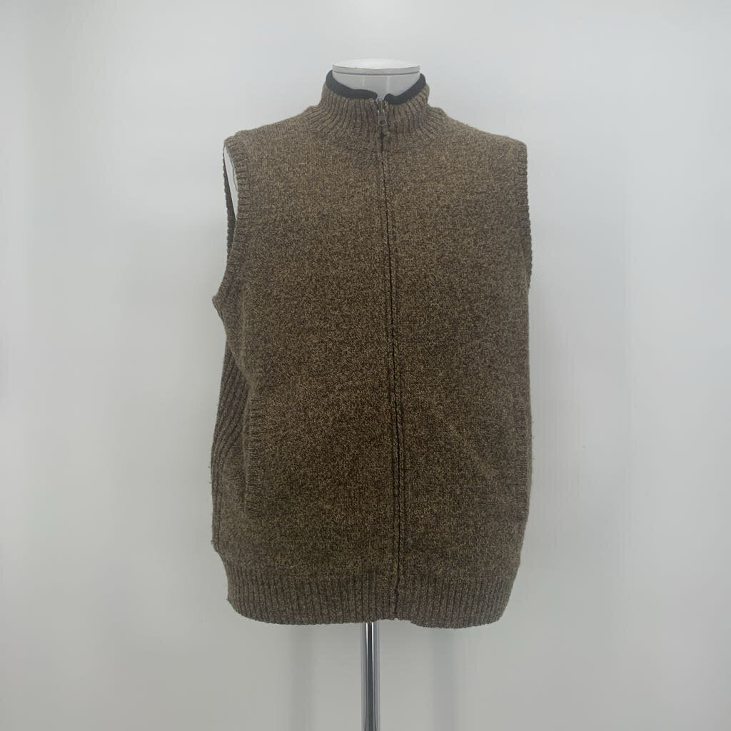 Brown knit wool to black fleece reversible outdoor style vest. Featuring front zip closure, two lower front pockets on knit side, One chest zip pocket on fleece side.