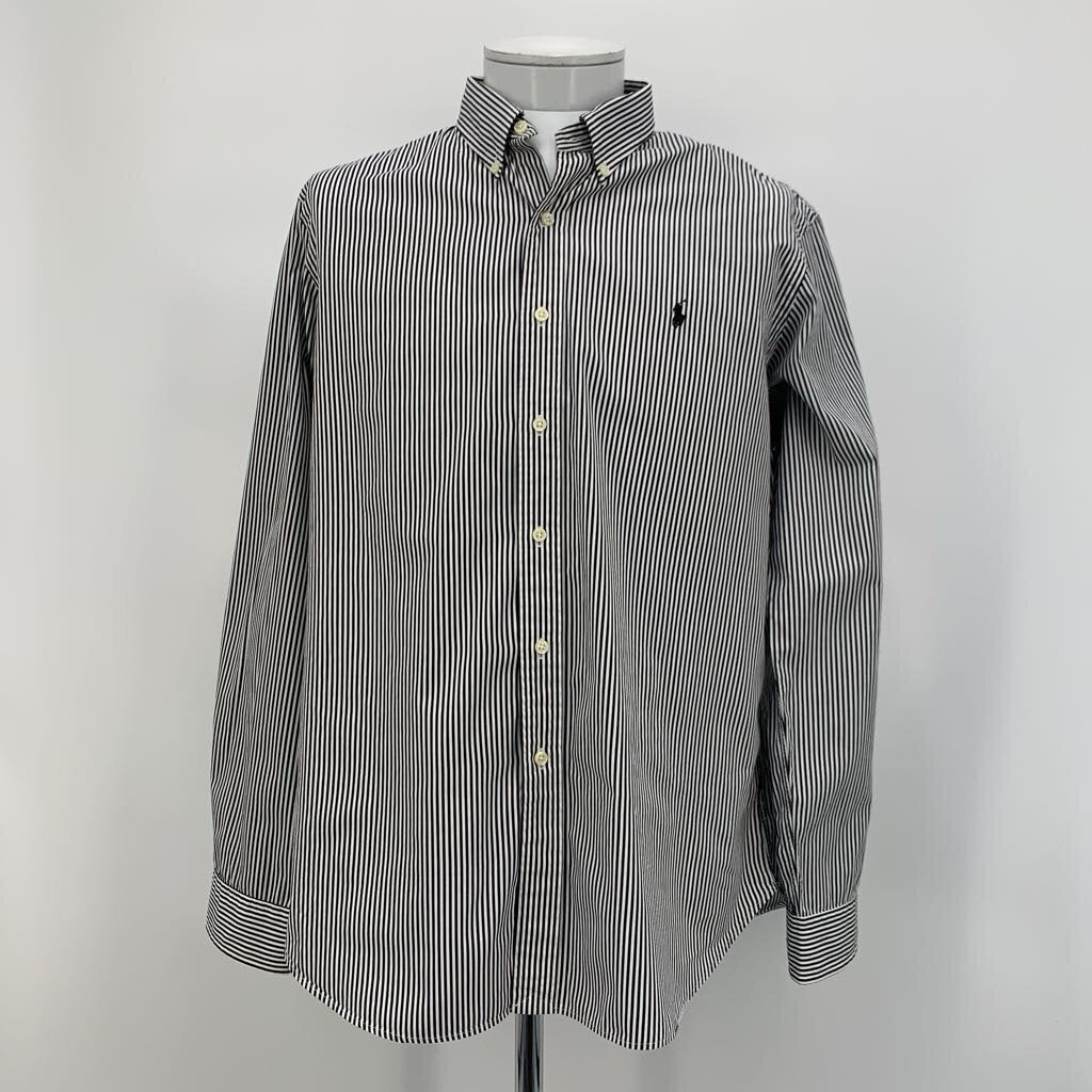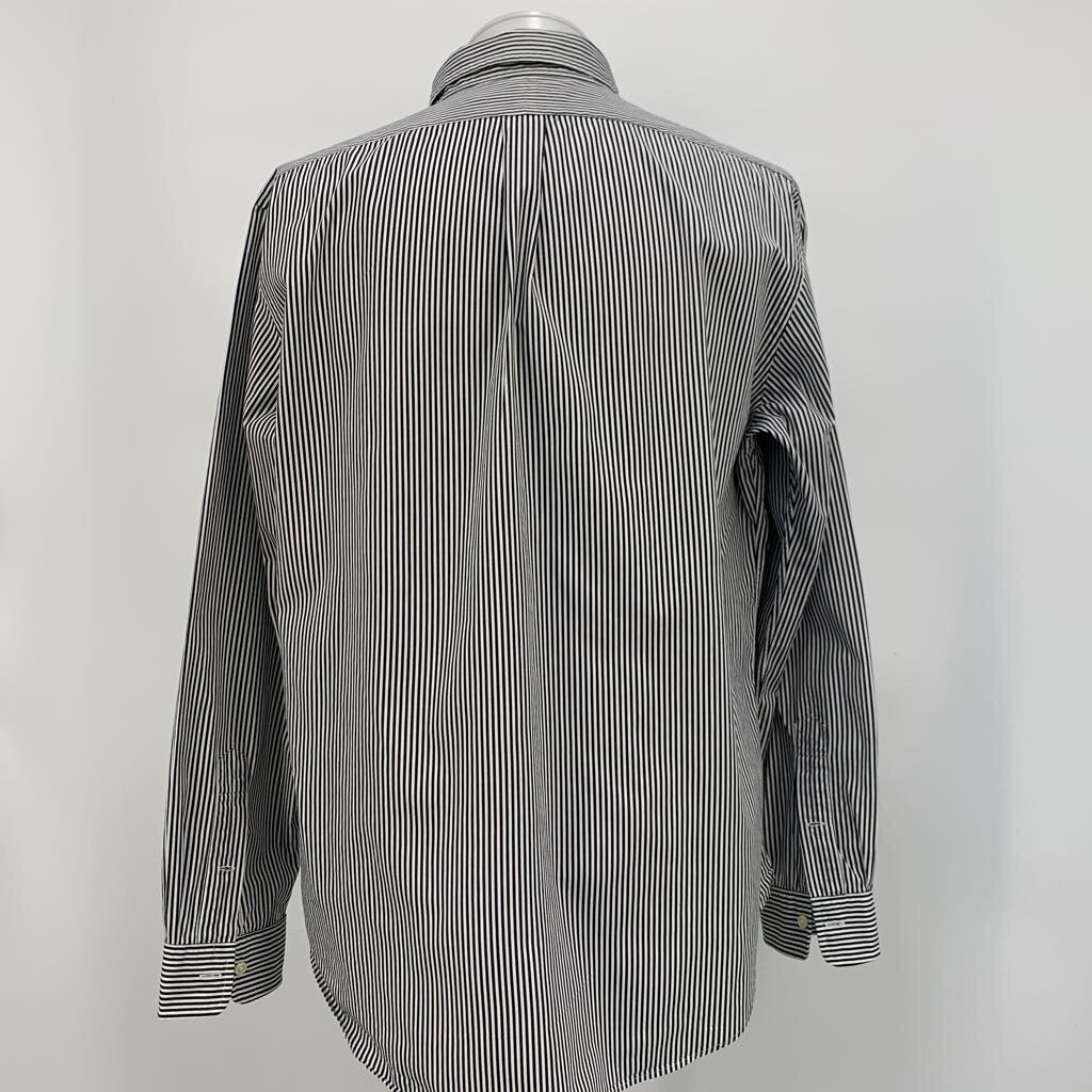 White and black striped ls button down shirt.
