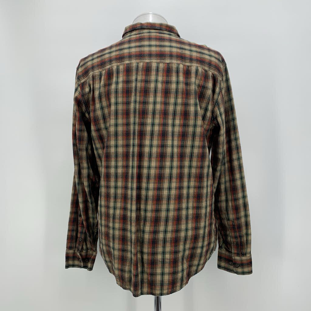 Tan and black plaid button up long sleeve flannel shirt with double chest patch pockets.