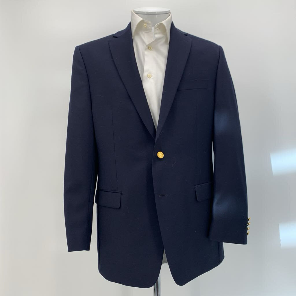 Navy sportcoat featuring notched lapel, two button closure, one upper chest pocket, two lower front pockets, two inner pockets, fully lined, with single vent in back.