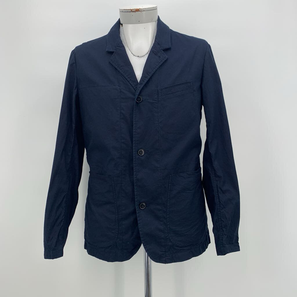 Navy Relwen Flyweight Flex Blazer. Features lightweight cotton fabric, cotton sateen interior trim, Welt chest pocket with two open patch hand pockets, Woven tape-backed reinforcements for durability, Stitched-through zipper storage pocket at inside right chest, and garment wash dyed. Original Retail: $298.