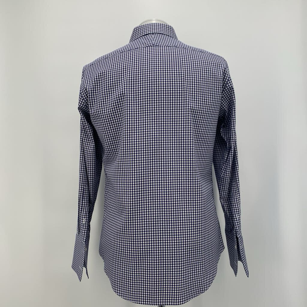 Navy gingham patterned button up long sleeve dress shirt with french cuff sleeves. Tagged "Fitted" and "Non-Iron".