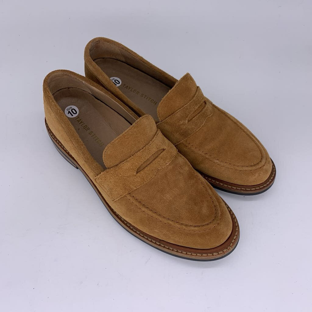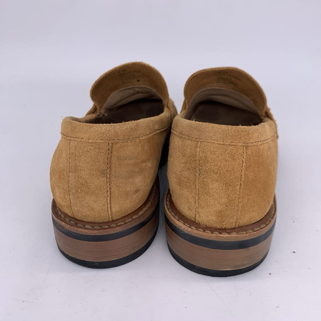 Tan penny loafers with suede leather upper and Vibram lugged rubber sole. Good, like new condition. Little to no wear on soles.