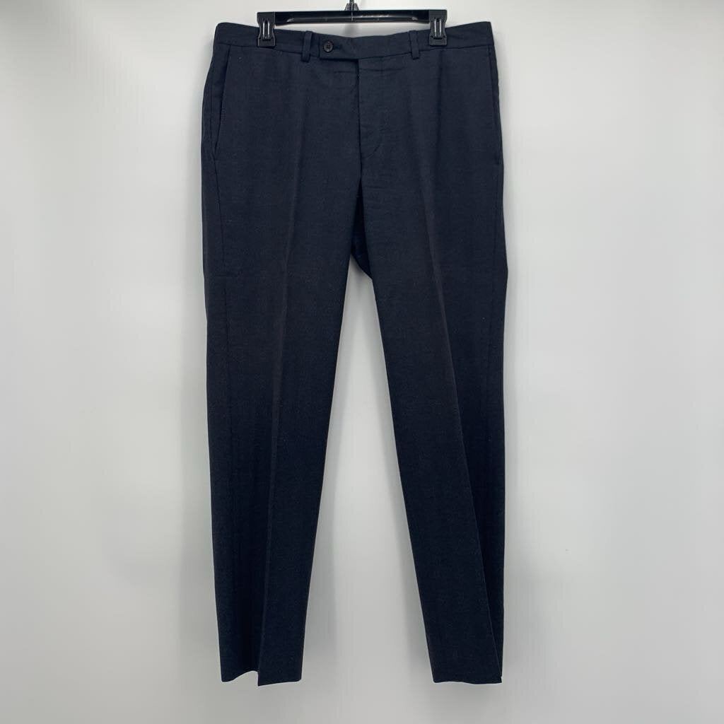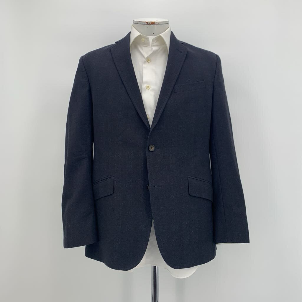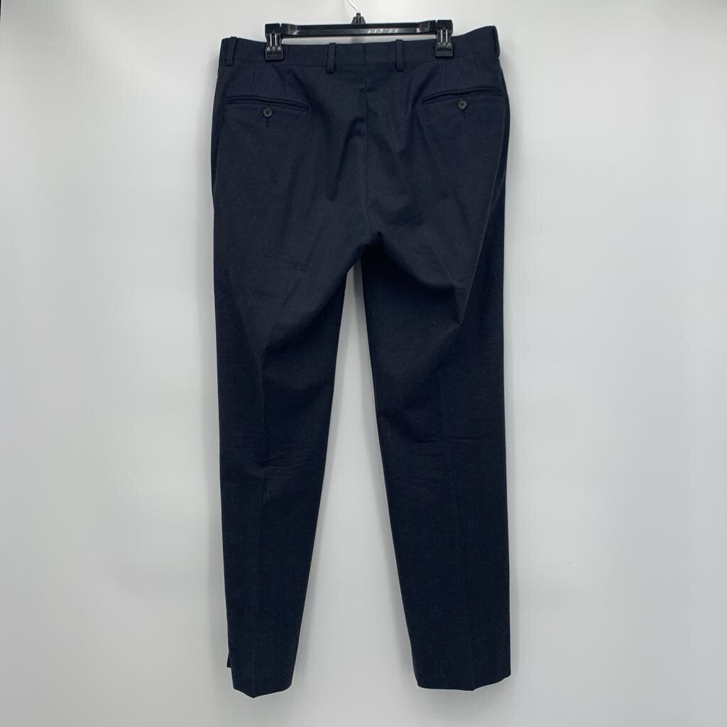 Navy check patterned suit. Sportcoat features notched lapel, two button closure, one chest pocket, two lower front pockets, four inner pockets, fully lined, with double vents in back. Pants are classic flat front style dress slacks.